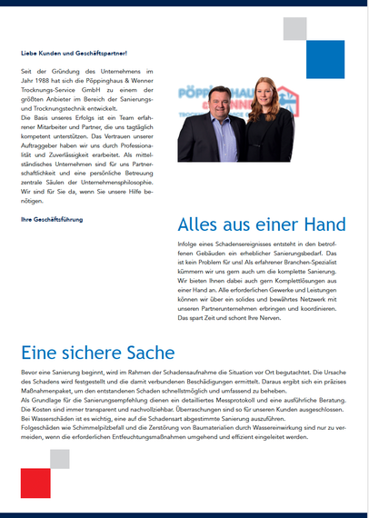 Die Pöppinghaus & Wenner Trocknungs-Service GmbH hat sich nach ihrer Gründung, im Jahre 1989, zu einem der größten Dienstleister in der Gebäudeschadenssanierung in Deutschland entwickelt.