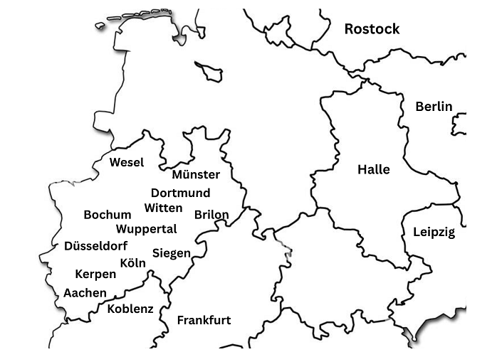 Kerpen, Aachen, Berlin, Potsdam, Brandenburg, Halle, Bochum, Brilon, Dortmund, Düsseldorf, Frankfurt, Koblenz, Köln, Münster, Siegen, Wesel, Witten & Wuppertal.
